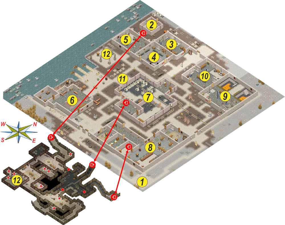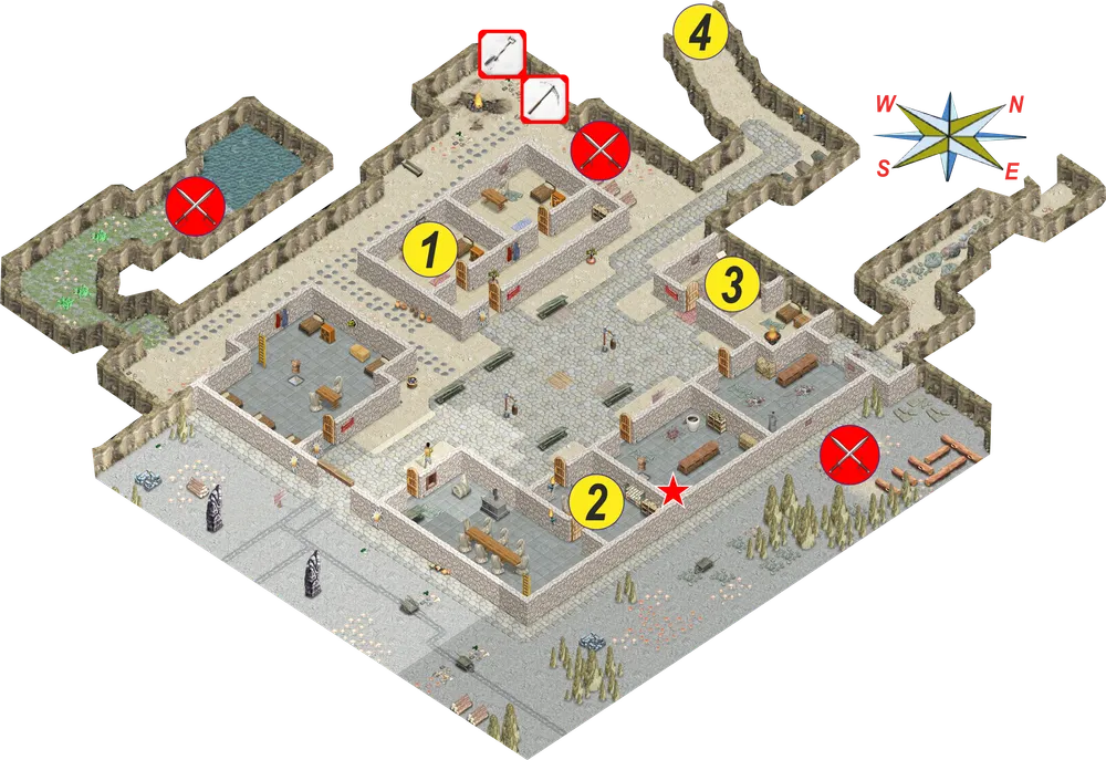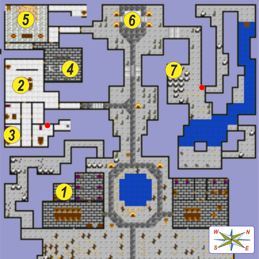 1 – магический пилон (у его подножия вырезана фраза: «Вел Нер Сем»). 2 – Шерил. 3 – магазин «Хорошее оружие Орсона». 4 – школа военного искусства Драко. 5 – магазин «Доспехи Эстер». 6 – верфь. 7 – склад руды. 8 – таверна «Дом Криспера». 9 – плавильня. 10 – кузница Бутелла. 11 – доска объявлений. 12 – капитан Энфорд.