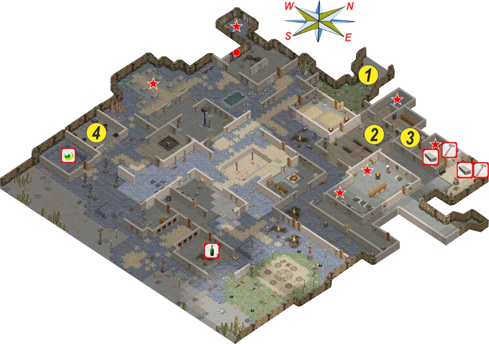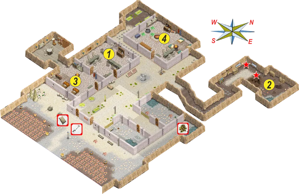 1 – задний вход. 2 – алтарь. 3 – сундук с бронзовым анкхом. 4 – комната без дверей.