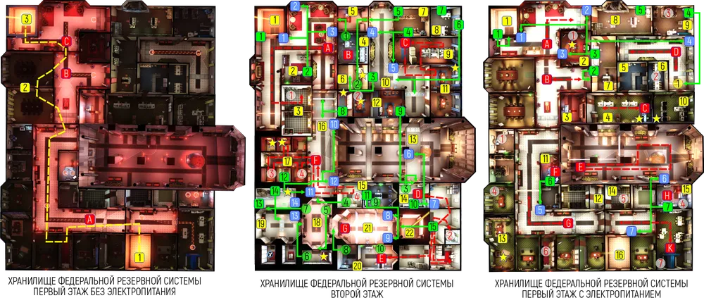 А-S – охранники; пунктирными линиями показаны их маршруты. Зелеными квадратами показаны выключатели, стрелки от них ведут к отключаемым объектам. Зелеными кругами показаны панели переключателей в полу, стрелки от них ведут к отключаемым объектам. Голубыми квадратами показаны камеры слежения. Звездами показаны контейнеры с добычей.