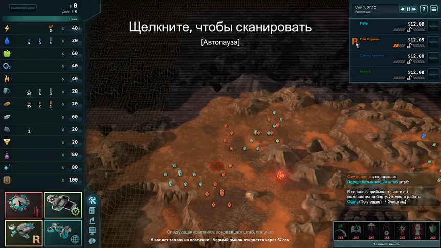 13. Долг – это очень хитрая штука. С одной стороны, в начале игры, когда у нас практически нет никаких предприятий, мы можем существовать, только приобретая ту же энергию или продовольствие «в долг», т.е. в кредит. Также периодически правительство Марса устраивает аукционы (например, покупка заявки или плитки с ресурсом). Выигрывая аукцион, мы дополнительно увеличиваем свой долг. И он постепенно растет, поскольку на него, как и на любой кредит, начисляются проценты. Обратная сторона медали – чем выше уровень долга, тем ниже рейтинг акций нашей компании и выше начисляемые проценты! Все начинают с рейтинга ААА, далее АА, потом А, а затем все последующие буквы алфавита, вплоть до Д. Д – это «мусорные» акции, которые практически ничего не стоят, поэтому их легко скупить конкуренту. Имея подобный рейтинг (при долге от 130 тысяч), мы лишаемся возможности пользоваться черным рынком (о нем ниже). Т.к. оценка нашего рейтинга происходит ежедневно в 24 часа «марсианского» времени, старайтесь до этого момента что-то предпринять для погашения части долга, если рейтинг ваших акций Д.