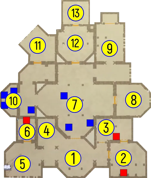 1 – приемная. 2 – запасники. 3 – кабинет Масленика Лидракса. 4 – кафетерий. 5 – читальный зал. 6 – кабинет Хазлин Костлявой. 7 – книгохранилище. 8 – тренировочный зал. 9 – защищенная комната. 10 – каминный зал. 11 – конференц-зал. 12 – зал Великого Указателя. 13 – комната проклятых книг.