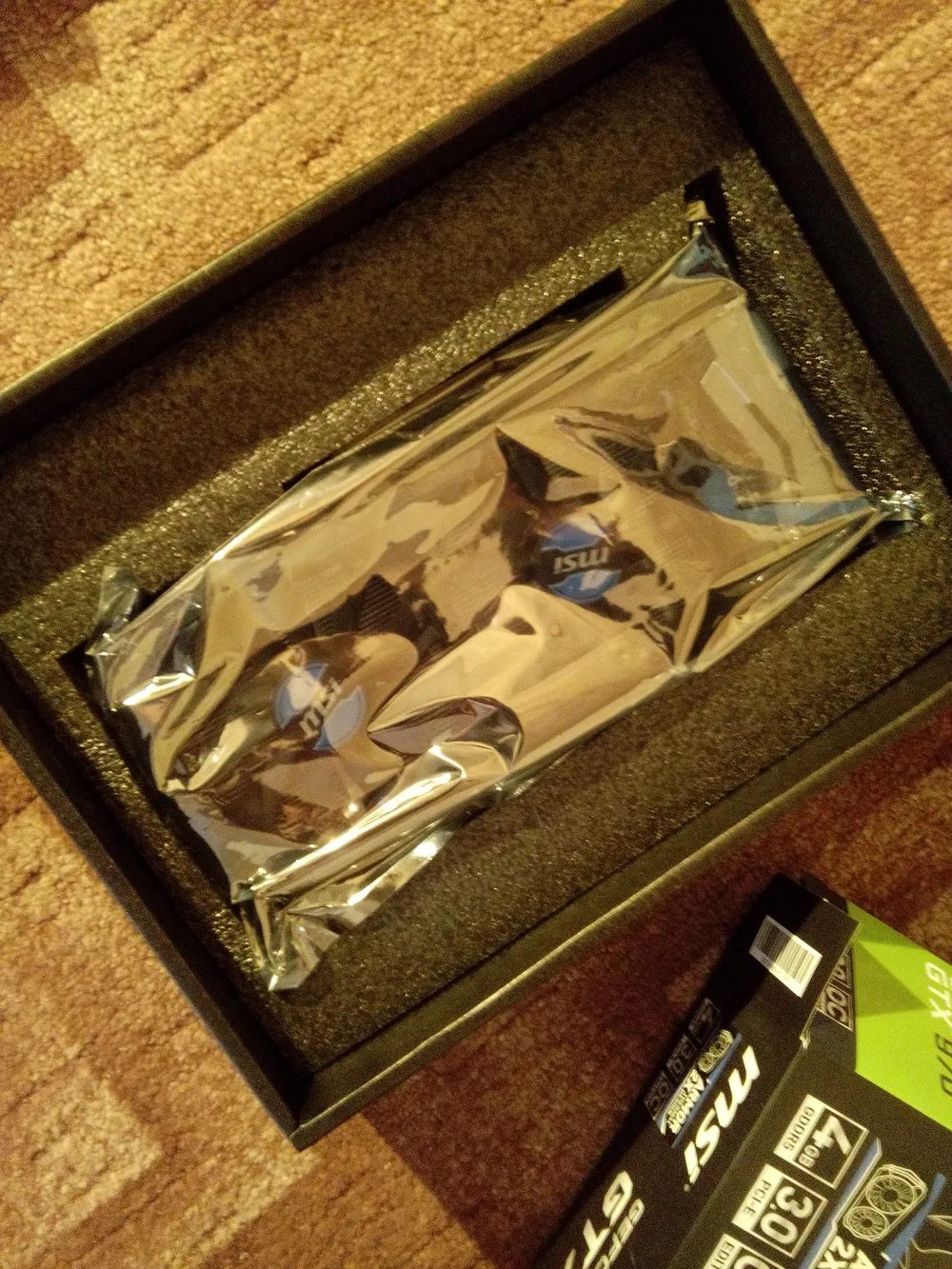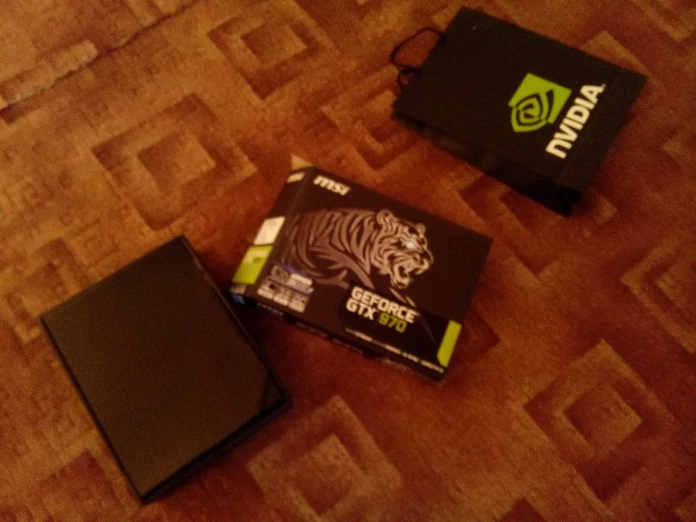 Недавно мне удалось занять первое место в конкурсе прохождений и обзоров по Dragon Age: Inquisition, и вчера мне наконец-то привезли главный приз – видеокарту MSI GeForce GTX 970 Tiger. Помимо нее в коробке оказался коврик, фирменный пакет NVIDIA и футболка. Ниже будет представлена фотография приза. Сразу скажу, что фотограф из меня никудышный, и снимать пришлось на «тапок», поэтому качество фоток не ахти.