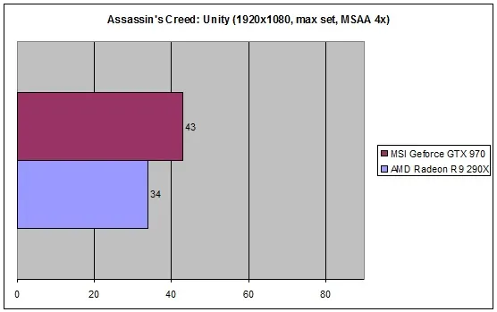 Для тестирования я выбрал несколько игровых проектов: Crysis 3, Metro: Last Light, Far Cry 4, Ryse: Son of Rome, Assassin’s Creed: Unity и Dying Light. Все игры запускались на максимальных настройках графики при Full HD разрешении. Показания FPS средние. Для сравнения была также взята AMD Radeon R9 290 X.