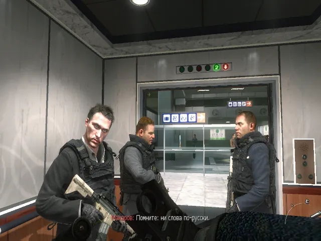 Макаров выбил пулемет из рук Аллена и прижал того к стенке. Обернувшись к своим, Макаров прошипел: