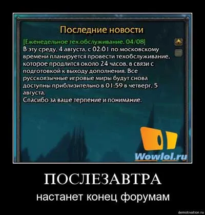6. Игроки официальных серверов следят за патчами, читают патч-нотесы...Постоянно что-то меняется, придумывают новые билды, что-то тестят, спорят! Вобщем - парилово недетское. На пиратском сервере всё иначе: т.к. сервер поддерживает только клиент версии 1.3.0, то на ней и играем. Зато всем известно за кого надо играть: на сервере 1 прист, 1 друль, 1 варлок и 20 варриоров. Прист и варлок скоро тоже за варов начнут, а друль кажется уже месяц в ВоВ не играет. Жаль, потеряли игрока, пусть и 2-го уровня