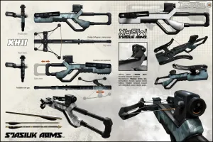Мощный и компактный арбалет способен пригвоздить человека к стене. Идеальный выбор для тех, кто придерживается правила снайпера Буна из Fallout:New Vegas - "Последнее, что ты не увидишь". Тихое, дальнобойное, стильное оружие для профессионалов. Существует модификация для вычисления траектории полета стрелы. Для этого арбалета подходят различные типы стрел, включая уже использованные.