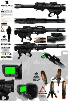 The 329-Series MPRS (Man Portable Rocket System) ракетная установка, произведенная фирмой Steiner Bisley; в зависимости от улучшений стреляет различными видами снарядов. В наличии имеются: противотанковые ракеты HEAT (High Explosive Anti-Tank) и ракеты дойного действия HEDP (High Explosive Dual Purpose). Ракеты произведены на российском оружейном заводе фирмы Kaiga. Для загрузки ракет в установку есть специальное отверстие посередине трубы. Для прицеливания к вашим услугам разворачивающийся дисплей. Плюс, есть возможность установить лазерный целеуказатель для управления ракетой прямо во время полета.