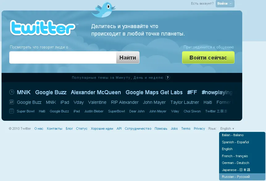 15 февраля знаменитый сервис микроблогов Twitter станет доступен на русском языке. Уже сейчас, у большинства бета-тестеров доступна возможность просматривать Twitter на русском языке, а так же добавилась функция Local Trends. Правда, сам Twitter ничего не подтвердил, но и не опровергнул представленную в СМИ информацию.