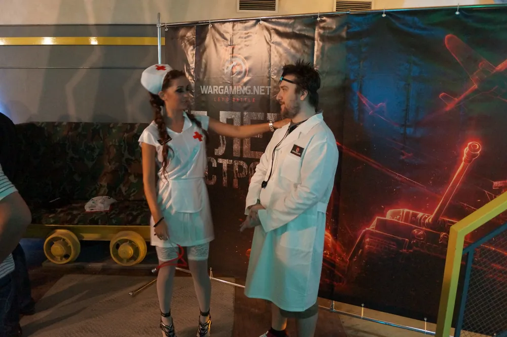 Чтобы народ не заскучал в ожидании официальной части мероприятия, компания Wargaming.net организовала самый настоящий пункт по призыву новобранцев на воинскую службу. Сначала был медосмотр – без него никуда. По бункеру ходили прекрасные медсестрички замерявшие давление у потенциальных защитников Отечества, веселый доктор раздавал живительные микстуры, определял физические параметры призывников, шутил и балагурил. Спустя несколько часов нам даже выдали военные билеты. Я стал профессиональным летчиком, хотя и метил в танкисты, а гражданку Sun_Mix и гражданину K. официально записали в дезертиры и заочно приговорили к расстрелу.