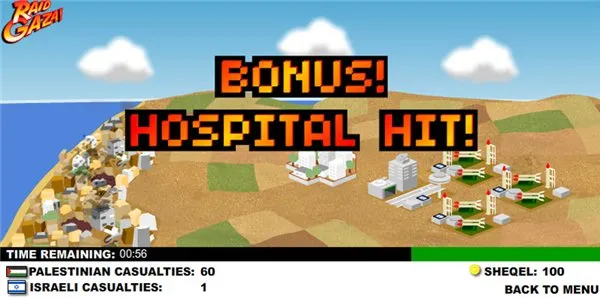 Raid Gaza! загружается со стилизованным под адвечнуру логотипом, открывая вид тесно прижатого сектора Газа к израильским землям. Потом Вы кликаете на "Go Raid ’Em!" и понимаете, что в этой игре невозможно проиграть, т.к. играя за Израиль, Вы только и делает, что сносите мешанину палестинских лачуг. По задумке это анти-израильская сатира, которая маскируется под обычную стрелялку во флеш. Но эффективна ли она? Я так не думаю.