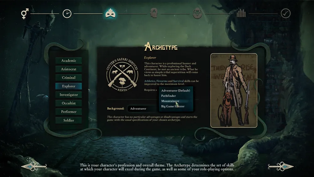 К каждому из восьми архетипов прилагается три дополнительных «предысторий». Аристократ, например, может быть обнищавшим — это уменьшит ваши начальные сбережения, но зато сам протагонист будет лучше в навыке «выживания». А сыщик может быть бывшим копом, у которого выше навык стрельбы, но уже расшатаны нервы (-5 к максимальному рассудку).