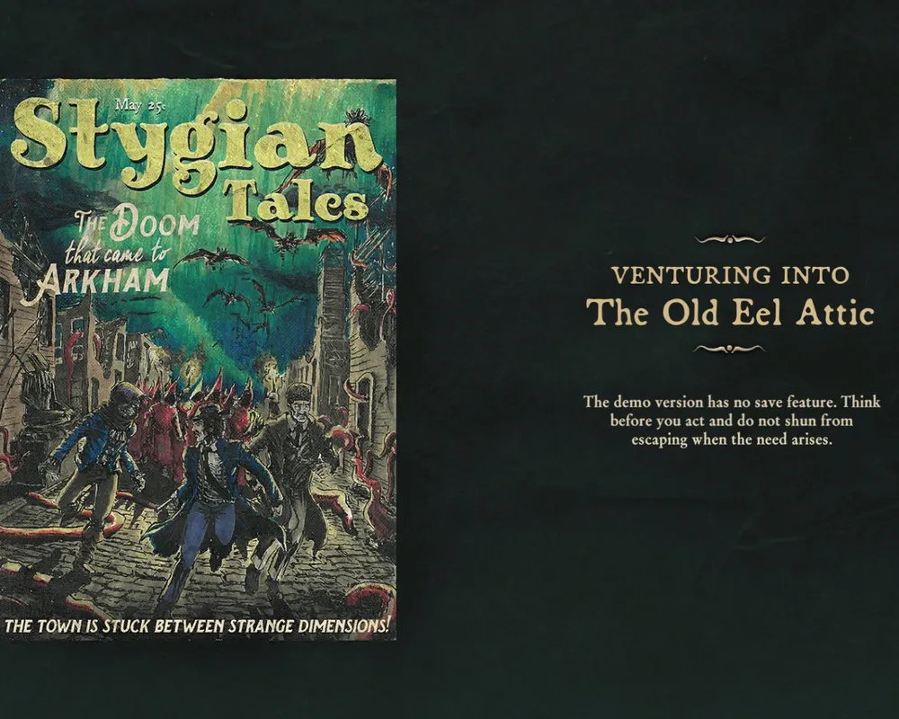 Конкретно сюжет Stygian начинается в духе поэмы «Ньярланхотеп». Главный герой встречает некоего мрачного человека (Dismal Man), после чего приезжает в город Аркхем. А потом настаёт «Чёрный день» и наш протагонист неожиданно оказывается в каком-то исковерканном адском измерении. Вместе со всем Аркхемом и его жителями. Что это? У нашего подопечного случился психоз? Или массовая галлюцинация накрыла всех аркхемчан? А может и правда, что говорят на улицах — это не Аркхем, а весь мир рухнул в бездну? А сам город — это всё что осталось от человечества?