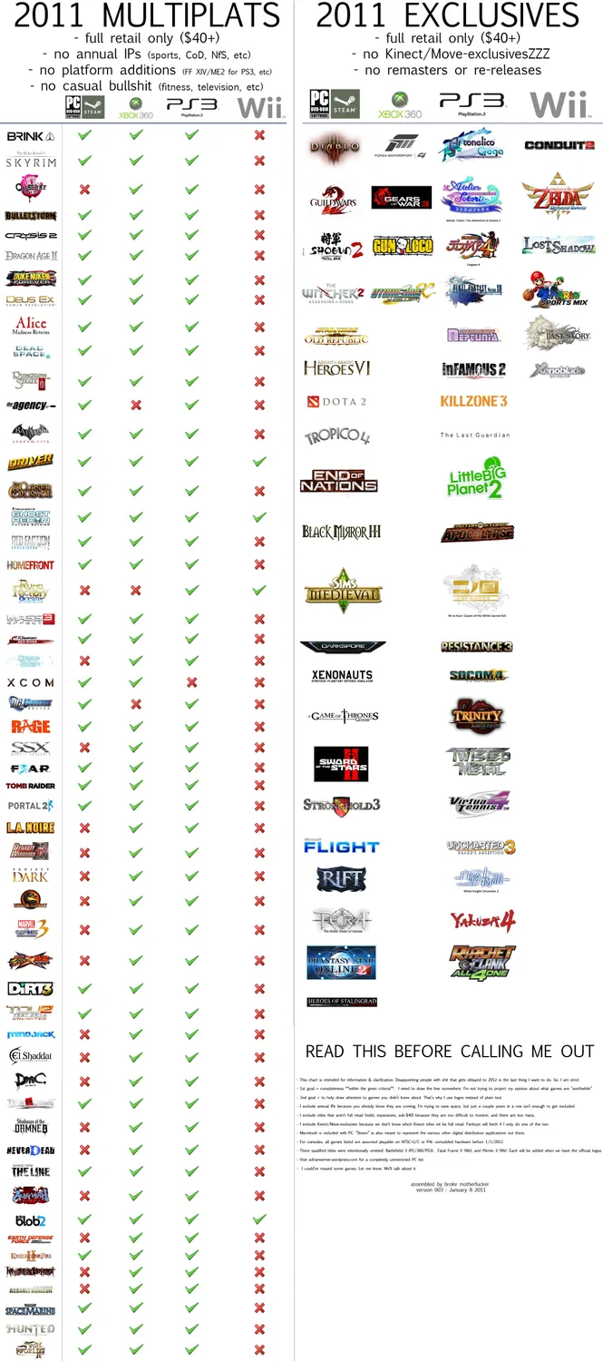 В общем, из таблицы всё понятно. Больше всего эксклюзивов у вечно хоронимой платформы под названием ПК (хотя те представленны в основном стратегиями) и у PS3. Однако выбор на консоли от Sony всё-таки ширше и разнообразнее. Ну, а X-коробка как водится отметилась чуваком мочащим монстряков.