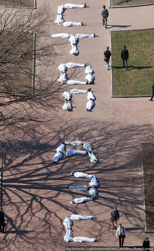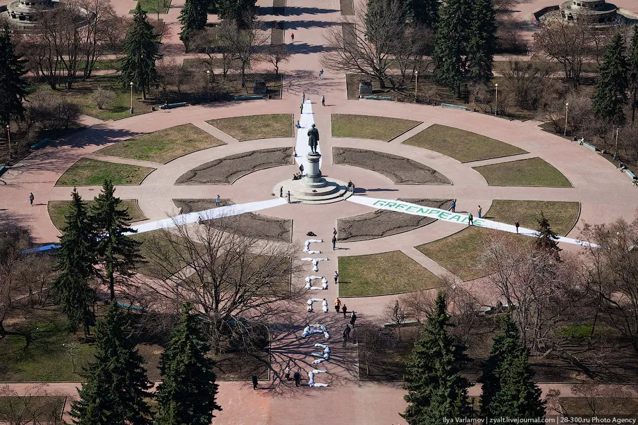 Сегодня активисты Гринписа провели акцию около главного здания МГУ. На площади возле здания они развернули символ ветряка и выложили телами надпись: "СТОП АЭС". Также сегодня утром в администрацию президента были переданы 23 000 подписей против строительства плавучих атомных станций. Гринпис попросил президента пересмотреть энергитическую стратегию России в пользу возобновляемых источников энергии. Как раз одним из символов таких источников является ветряк.
