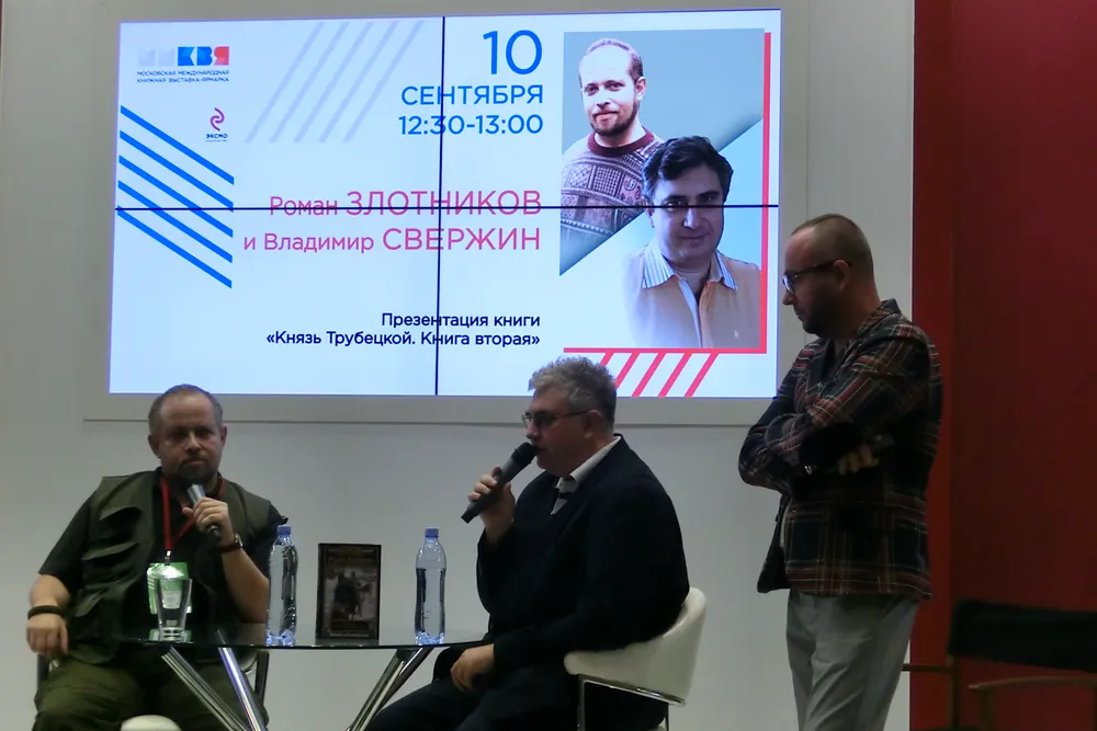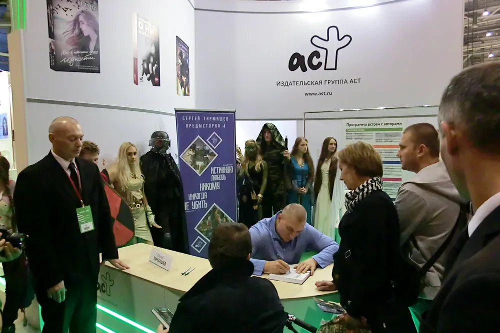 Тем временем на соседнем стенде – ЭКСМО – общались с читателями Головачёв и Злотников, Прокопенко.