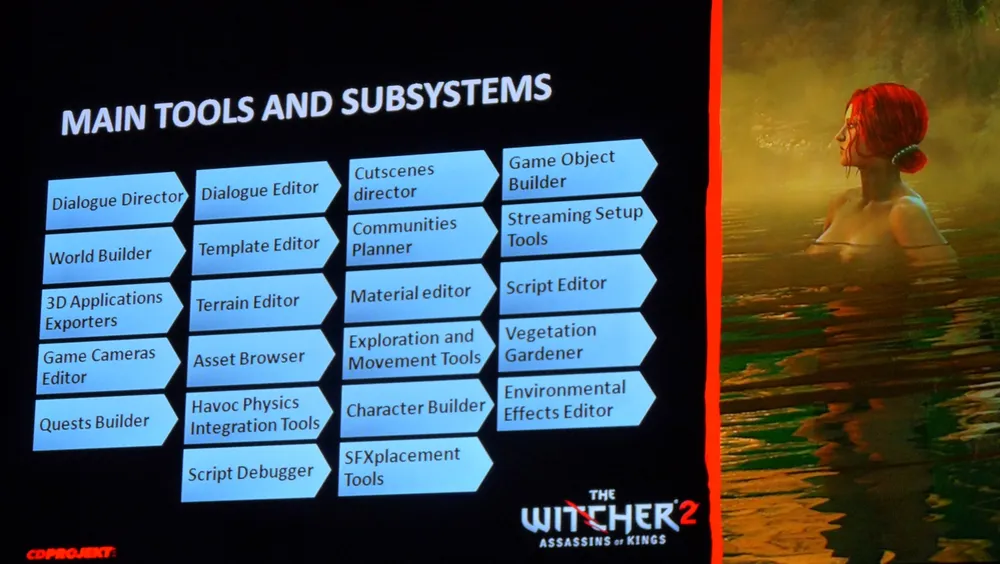 Ответственный по дизайну игры представил нам игру, и мы изучили кучу информации относительного различных нововведений в игру и прочих элементов. Скажу сразу, будет не больше 4 мест (локаций), где нам нужно будет смотреть на «экран загрузки» (вместо около 76 подобных подзагрузок в прошлой части). Кроме того, игра может быть начата целыми 3-мя различными способами, а закончена и вовсе 16-разными вариантами! Нам пообещали около 256 кинематических вставок (против 150 в прошлой части). Самое интересное, что Геральт сможет примерить за игру около 30 видов брони и использовать 6 видов магии (против 5 в прошлом). Разновидность оружия ограничена 6 или 8 видами мечей. Больше не будет бесполезного дополнительного оружия, которое мы не могли использовать в «Ведьмаке».
