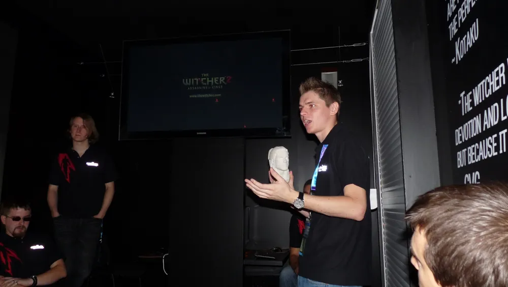 Я прибыл на GamesCom в 9ч утра 18 августа и сразу отправился к стенду «Ведьмака 2», где меня встретил Tom Ohle, руководитель проекта. Он направил меня в комнату, где мне и предстояло посмотреть презентацию игры и увидеть большой сюрприз! Сама презентация состояла из 3-х частей: демонстрация элементов игры и показ двух разных отрывков геймплея.
