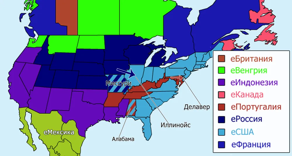 Похоже в Америке наступает временное затишье. еИндонезия, после захвата Мисиссипи остановила наступление. Более того, армии еПортугалии закрыли доступ американцам к индонезийским штатам, захватив штат Алабама. Фактически сейчас заблокирована и еРоссия, она может атаковать только 4 штата: Огайо, Иллинойс, Индиану и Миссури. После чего русская армия упрется в португальскую границу. Очевидно, что завершающий удар по восточным штатам нанесет именно еПортугалия, а еРоссия, после освобождения штатов в своей зоне ответственности, поддержит наступление португальцев. Видимо тоже самое будет делать и еИндонезия. Несколько минут назад еРоссия смогла освободить первый из четырех штатов - Миссури, и уже атаковала следующий - Иллинойс. Это последний штат с хай-нефтью под контролем американцев, кроме того, в нем более 500 жителей. Одновременно португальцы начали наступление на штат Делавер. Практически пустой штат, но зачем-то американцы отстроили там защиту 3 уровня.