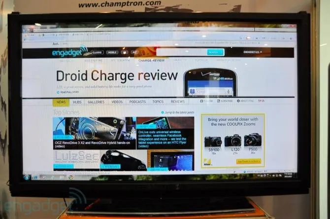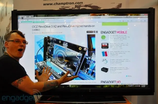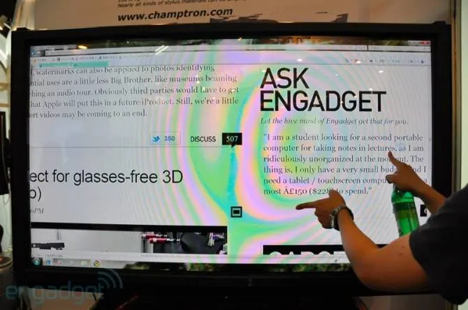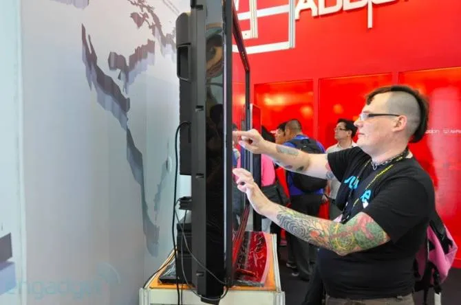 Этот гигантский монитор от Sharp был представлен на выставке Computex 2011. Он проигрывает 1080p видео и умеет распознавать 2 точки касания. При этом, можно использовать тонкий стилус, что будет удобно например в Photoshop. Смотрите видео.