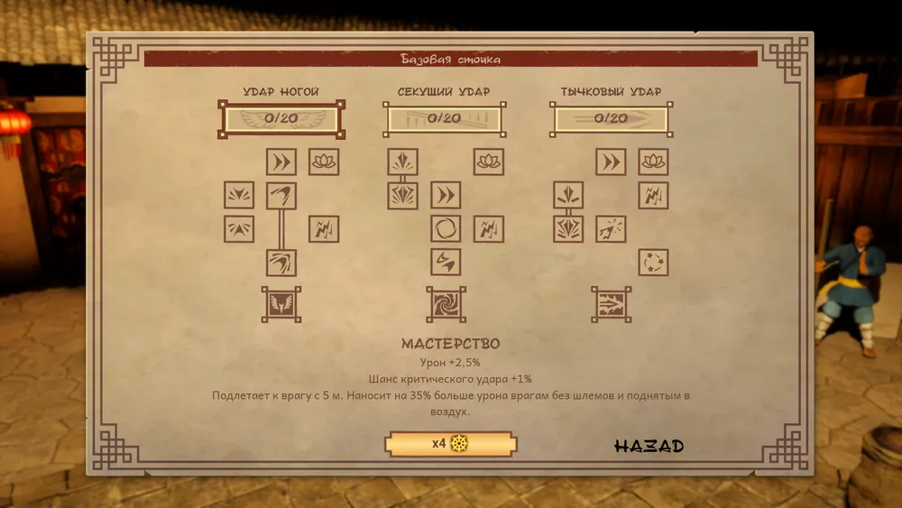 Стоит дополнить жанр 9 Monkeys Of Shaolin и определить его как: beat ‘em up с ролевыми элементами. Здесь нет такого понятия как «уровень персонажа», но мы развиваем своего героя, постепенно вкладывая очки навыков в необходимые боевые умения, экипируем предметами, которые дают новые бонусы – монахи люди аскетичные, помимо оружия, могут носить лишь четки да обувь. Также, с каждой главой увеличивается показатель здоровья Вей Чена.