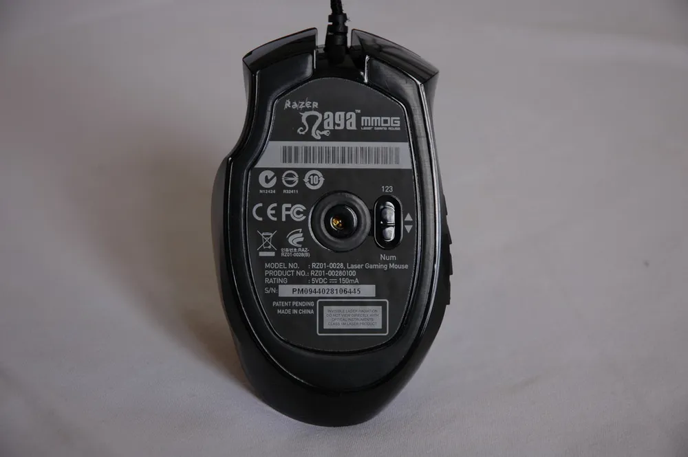 Так же на днище расположен переключатель с надписями «Num» и «123». Он предоставляет вам выбор, как будут работать кнопки на боковой панели. Соответственно «Num Pad» или кнопки с 1 по 9 а так же «-» и «=».