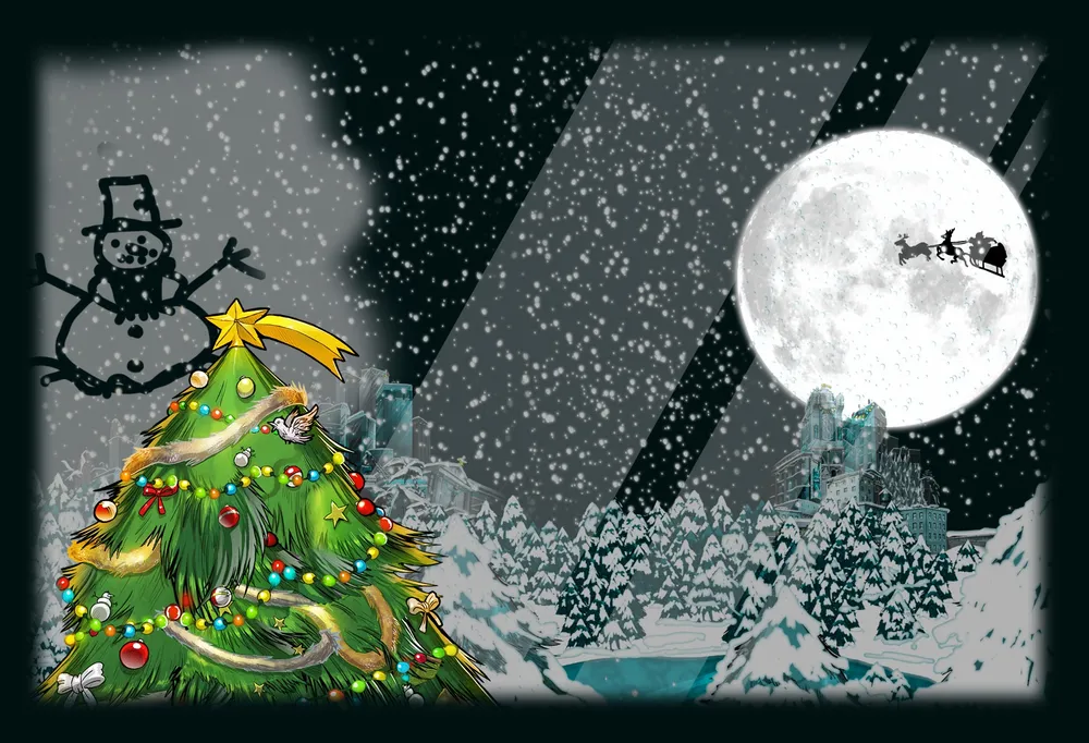 Сам фон меняется, в зависимости от времени суток, перед нами предстают либо солнечное утро, либо снежная лунная ночь, в вечерней вариации не обошлось и без зарубежного трудяги Санты, его можно рассмотреть на фоне луны, правда оленей поубавилось по моему... =) Но неизменной частью является символ нового года - новогодняя елка, которая радует нас в левом углу круглые сутки.