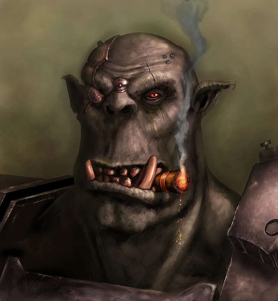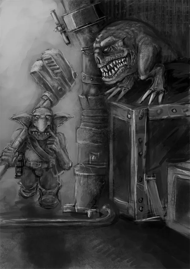 Из мастерской появился Стволух Механьяк, вытиравший руки о засаленный фартук. Он был орком крупным и, как и у шнягопаса, на его лицо была нанесена толстая синяя полоса. По его одежде Наззгронд предположил, что технарь посещал ту же свалку тряпья, что и Сназбод, хотя лоскутной балахон и был покрыт толстым слоем грязи и сажи. Гретчин-надсмотрщик Стволуха, Ветликк, опасливо смотрел на посетителей, прячась за ноги хозяина.