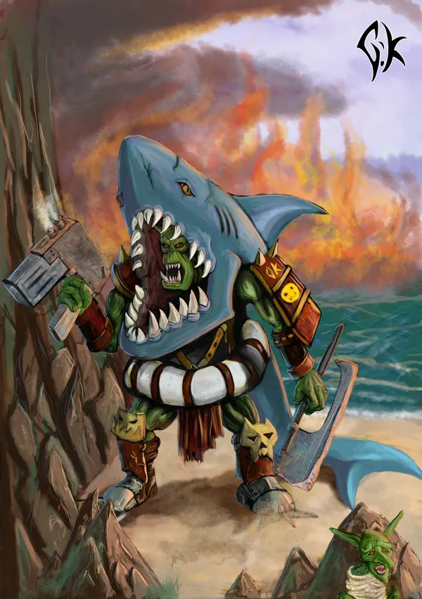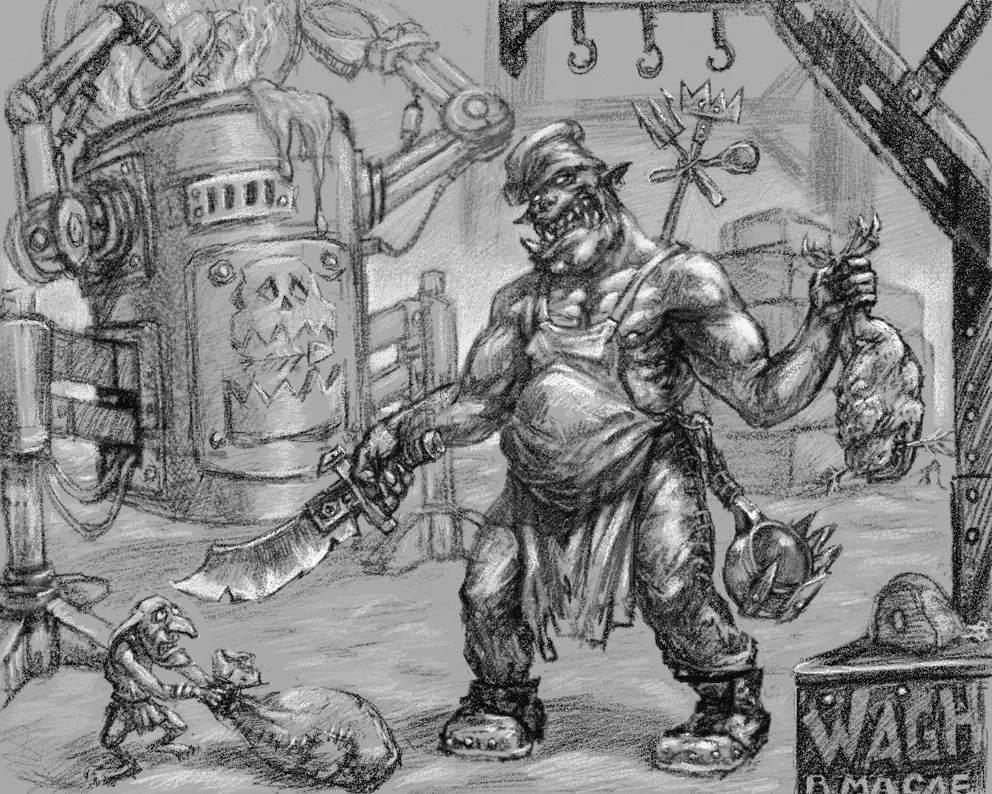 - Кхм! — на сей раз покашливание было куда как погромче, перекрыв славный грохот орочьего войска на полном ходу. Великая воображаемая банда Наззгронда медленно испарилась, сменившись не столь приятной харей гретчина-слуги Зубоскала. Взбешённый пробуждением, Наззгронд потянулся, чтобы заехать гретчину в ухо, но не рассчитал движения и хряпнулся мордой в пустое сквигово корыто. Зубоскал, всегда находившийся вне досягаемости, радостно подскочил, чтобы помочь шишке Гоффов подняться.