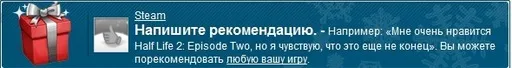 Напишите рекомендацию. - Например: «Мне очень нравится Half Life 2: Episode Two, но я чувствую, что это еще не конец». Вы можете порекомендовать любую вашу игру.