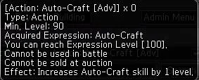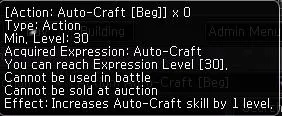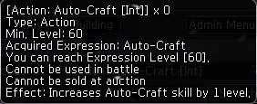 Auto Craft — используется для автоматического крафта, применяется не в бою, с уже загруженными ингредиентами для крафта, клавишей Z. Действие можно купить на маркете средняя цена за AutoCraft[beg] – 700k золота, а так же за квест Don't Scare Me! .