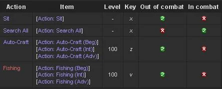 В игре существую несколько различных действий для игрока например:AutoCraft или Sit(сидеть). На самом начальном этапе игры, у героя нет отсутствует возможность авто сбора лута или присесть, что бы восстановить здоровье. Все действия учатся из таких предметов
