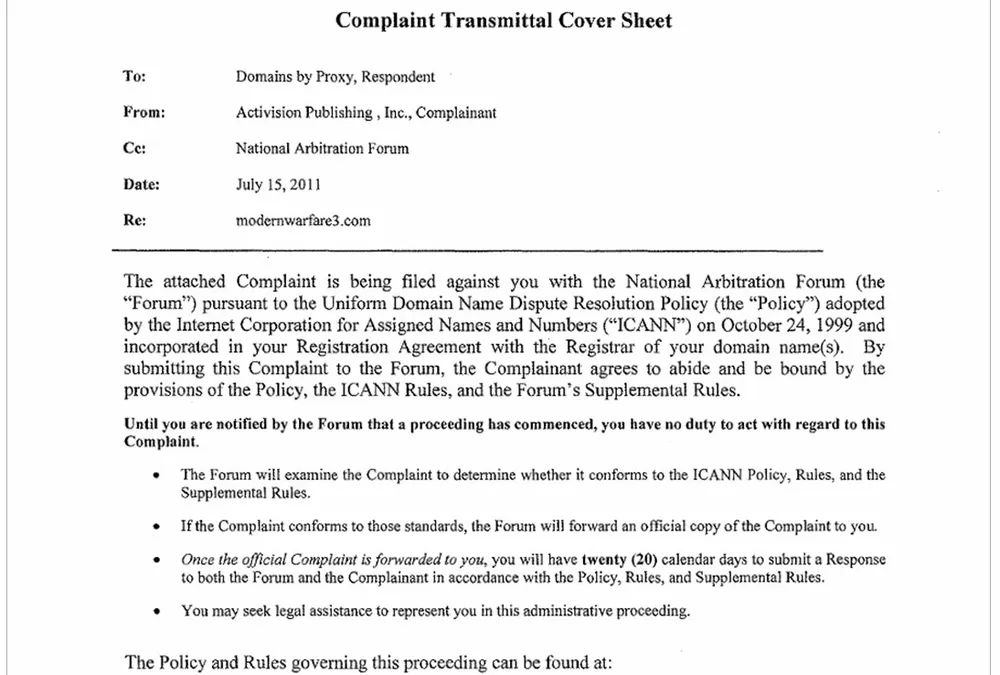 Activision утверждает, что человек причастный к взлому сайта ModernWarfare3.com "не имеет права или законного интереса к доменному имени." Activision предоставила список на две страници достижений Modern Warfare в качестве доказательства своего права на домен, или возможно, компания хочет получить награду в письменной форме от CNN как "Лучший шутер". Activision утверждает, что сайт содержит авторские материалы, в том числе стиль заголовка Modern Warfare 3, и, что владелец "поддерживает игру Battlefield", призывая посетителей забыть о Modern Warfare 3 (потому что игра выглядит так же, и как предыдущая часть) и купить Battlefield 3.