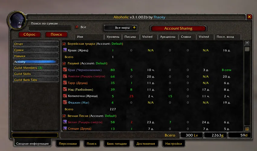 - Сводная информация по активности персонажей, последний вход, почта, аукционы и ставки.