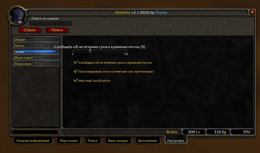 Напоследок хочется рассказать про эту функцию аддона, которую можно включить в настройках. Она позволяет обмениваться данными про ваших персонажей между игроками. Главное не храните в почте секретную любовную переписку :)