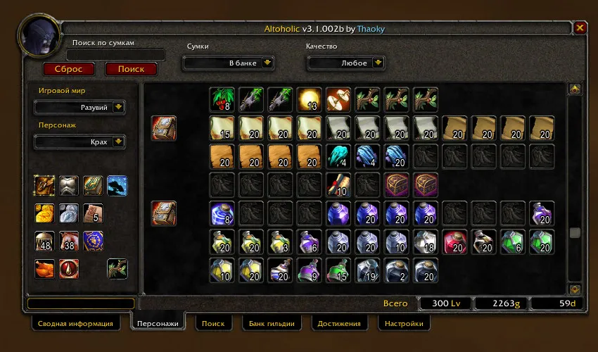 Иногда забываешь куда и кому отправил тот или иной предмет. Или с какого персонажа можно взять 10 пачек ткани для прокачки первой помощи очередного "альта". Тут то и пригодится поиск. Ищет по всем сумкам всех персонажей или только этого мира, в банке гильдии и вашем собственном, почте персонажей, профессиях, а так же между серверами. После поиска можно смело заходить богатым "альтом" и грабить его :)