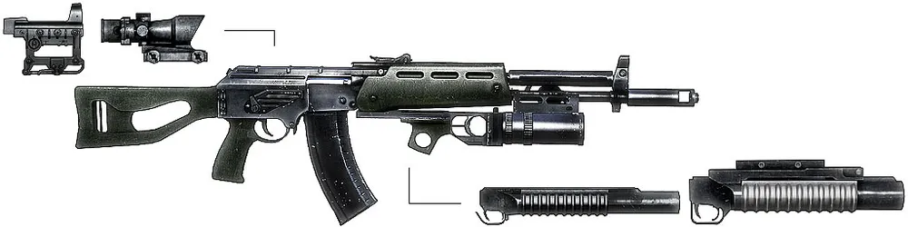АЕК-971 - автомат калибра 5.45х39 мм, был разработан конструкторским бюро Ковровского механического завода. Разработанный еще в начале 70х годов этот автомат проходил все сторонние испытания в рамках программ по разработке нового оружия для Советской Армии. Показав отличные результаты АЕК-971, так и не победил ни в одном из них, хотя и не уступал принятым на вооружение, в 70х автомату Калашникова – АК-74, в 80х автомату Никонова - АН-94 "Абакан". Основной особенностью, разработанного под руководством С.И. Кокшарова автомата, явилось использование схемы с так называемой "сбалансированной автоматикой". Согласно этой схеме подвижные узлы автоматики оружия имеют кроме затворной рамы еще и специальный балансир. Которые связаны между собой через шестерню и зубчатые рейки. Поршни рамы и балансира, под воздействием пороховых газов, отводимых из канала ствола, двигаясь с равной скоростью в противоположных направлениях, компенсируют импульсы движения друг друга. Таким образом, достигается значительное снижение отдачи оружия при стрельбе, по сравнению с традиционной схемой автоматики.