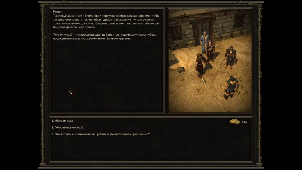 Кат-сцена. Мутная личность по имени Леон предлагает услуги эскорта по Трущобам. Недорого. Всего 10 империалов. Если согласимся, сопровождает к первой развилке. Там начинают собираться бродяги, он их распугивает. Можно уйти или продолжить путь. Вроде всё хорошо. Или нет? Совершенно точно – нет. Попадаем в укромный угол, в котором нас уже ждут бандиты. Вне зависимости от того, что мы скажем, будет драка против пятерых прилично вооружённых бандитов.