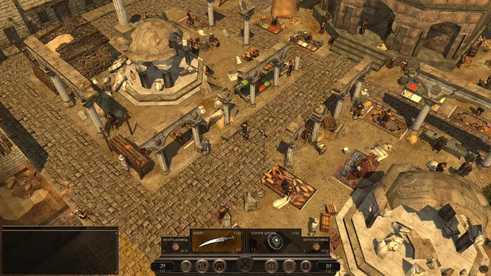 Нас встречает местный лекарь, рассказывает о своей нелёгкой жизни. На площади перед полуразрушенным храмом полно торговцев – барыг. У одного из них можно обнаружить интересную штуковину – голову статуи с механическим глазом. Он предложит её купить за пару сотен, но (торг 4) цену можно сбить до 100. Не теряя времени даром, идём к лекарю, показываем. Он говорит, что если хочешь, могу вживить его тебе. Недорого – сотня всего за операцию. Так мы обзаводимся дополненной реальностью. Действует она, правда, всего в паре мест (ну, или я больше не нашёл). Но на что только не пойдёшь ради интереса. В принципе, на площади из интересного остаётся лишь барыга Зеб, торгующий алхимическими ингредиентами, в т.ч. порохом, нефтью, а также бомбами и «жидким огнём».