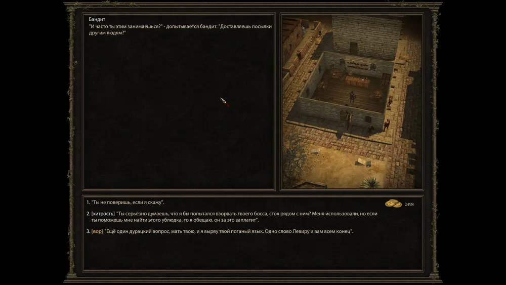 Если предпочли разговоры драке, то дальше наемники по описанным приметам наведут нас на след отправителя. Это Кальв – сын богатого дворянина, проигрался в карты, а его долг выкупил Нерос, мир его праху. Появится повод заглянуть в Дворцовый квартал.