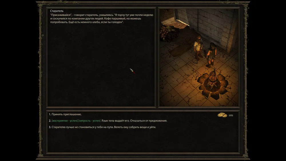 На крыльце перед библиотекой у костра сидит какой-то старатель и предлагает лучший кофе на дорогеприсоединиться к чаепитию. Принимаем приглашение, садимся рядом с ним. (Восприятие + хитрость) Язык тела выдаёт его, отказаться от напитка.