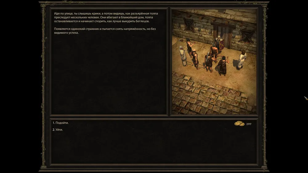 В общем, стражник спросит, не сможем ли мы удержать толпу от самосуда, пока он не придёт с подкреплением? Можно отказаться, но соглашаемся и вот остаёмся один на один с разъярённой толпой. Варианты действий.