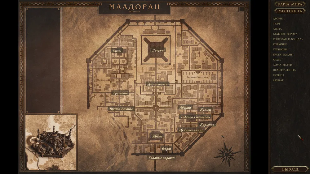 Продолжаем исследование города. Прямо в центре стоит колизей – т.н. Арена. На ней проводятся гладиаторские бои. Побеждаешь, собираешь вещи с убитых и небольшое вознаграждение, плюс тренируешь боевые навыки. Вору такое не очень подходит, но первые 2 раунда можно без перенапряжения пройти. Чуть позже, после получения доспеха древних, уже можно легко достичь звания «Гладиатор», после чего откроется доступ к более серьёзным противникам (правда сначала надо защитить торговца Василия от двух наседающих бандитов). Огибаем Арену справа, находим дом Домиция Ульпия, он рассказывает о своей экспедиции, говорит, что сам толком не может рассказать местоположении посещённых мест, но вот их картограф Гай Левин из Ганеззара может рассказать больше. После беседы дадут +18 ОН. На выходе нас будет ждать стража Гэлия с приказом провести нас к нему. Можно отказаться (безнаказанно) или пойти поговорить. В ходе беседы, он расскажет, что будь его воля, он предпочёл бы видеть Храм уничтоженным, чтобы дать людям самим определить свою судьбу, без всяких богов. Предложит сотрудничество, мы его принимаем, но нам отказывают по причине низкой (0) репутации у Дома Аврелия. Если не ошибаюсь, требуется не ниже 5. После разговора, нас возвращают к дому Ульпия.