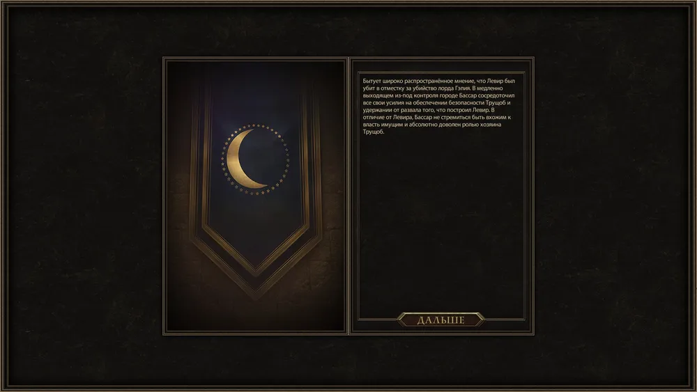 Больше на данном этапе в Маадоране делать нечего, переходим в Ганеззар. Нам расскажут о том, что после убийства Гэлия, власть в Маадоране перешла его не сильно одарённому племяннику, при нём усилились «бояре», каждый из которых захватил власть в своём районе города при помощи собственного ополчения и стал собирать налоги в свою пользу, издавать законы, отправлять правосудие. Поползли слухи о том, что Левира убили в отместку за убийство Гэлия. Преемник Левира Бассар не был столь же одарён и честолюбив, как предшественник, посему власть Гильдии сохранилась лишь на территории Трущоб.