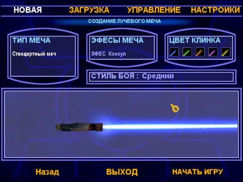 Трепещите джедаи, ибо теперь вы будете создавать свой меч! В начале игры можно выбрать только настройку одного меча, в то время как в мультиплеере можно настроить два меча и двойной меч. Кстати, называется это в этой версии «Создание лучевого меча» — вероятно, переводчики ни разу не видели Звездных Войн! Для типа меча можно настроить рукоятку, т.е. эфес. Всего есть около 10-12 типов. Ну и на последок, можно настроить цвет лазерного клинка, выбирая из 5 цветов. Все это можно делать для отдельного стиля владения меча.