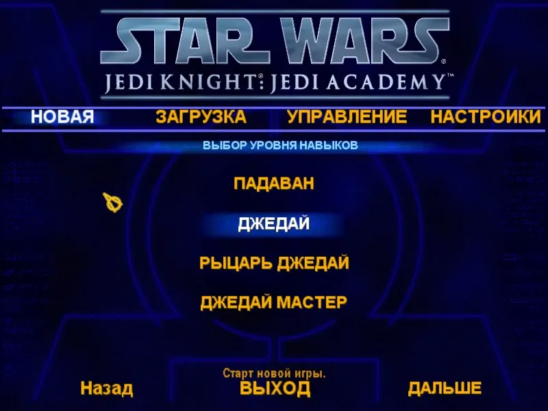 Игру можно начать с четырех уровней, знакомым нам по JK2: Jedi Outcast: «Падаван» (AI абсолютно не составляет конкуренции), «Джедай» (с этого все начинают), «Рыцарь джедай» и «Джедай мастер» (вернее было бы «Мастер джедай»).После этого начинается вкустность! Мы создаем свой персонаж! На выбор, как вы уже знаете, есть 6 базовых персонажей: человек мужчина, кель-дор мужчина, родианец мужчина, твилек женщина, забрак женщина (помните Дарт Мола из Эпизода I?) и человек женщина. В общем, 3 женщины и 3 мужчины.