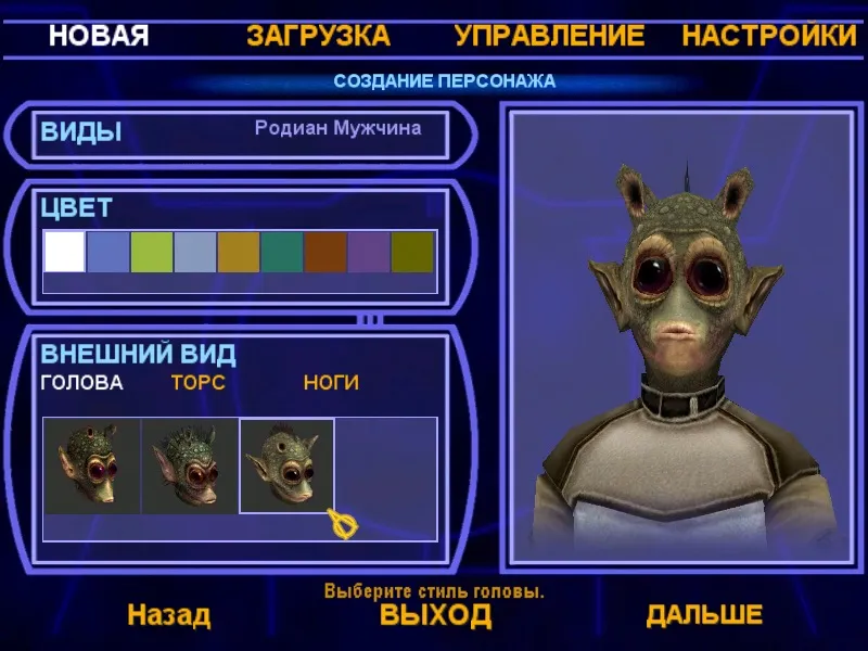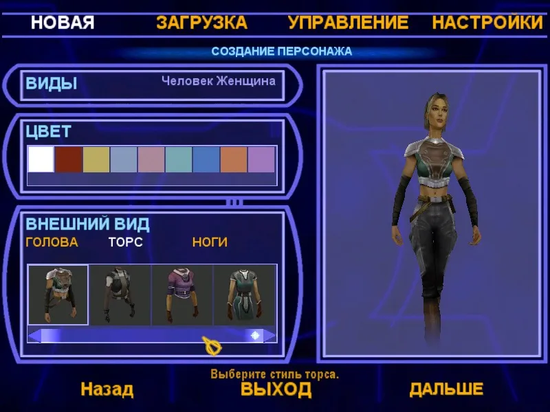 Потом настраиваем цвет персонажа: это в основном цвет вставок одежды. Далее можно настроить голову (у человека 3 примера: негр и два белых), торс и ноги. У женщины твилек, к примеру около 7 типов головы, которые отличаются убранством ее хвоста. Настройка торса и ног заключается в подборе одежды. Вот тут обнаружится глюк версии: второй костюм (т.е. торс) у мужчины-человека не отображается — такое впечатление что модель для него просто отсутствует!