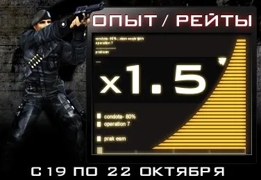 Уважаемые пользователи, администрация проекта Operation 7, как и обещала ранее, продолжает радовать вас подарками и сюрпризами. В ближайшие три дня (с утра пятницы до утра понедельника) в различных каналах проекта запущена акция «Золотой опыт», по которой будут включаться увеличенные опыт и золото в полтора раза на различное время.