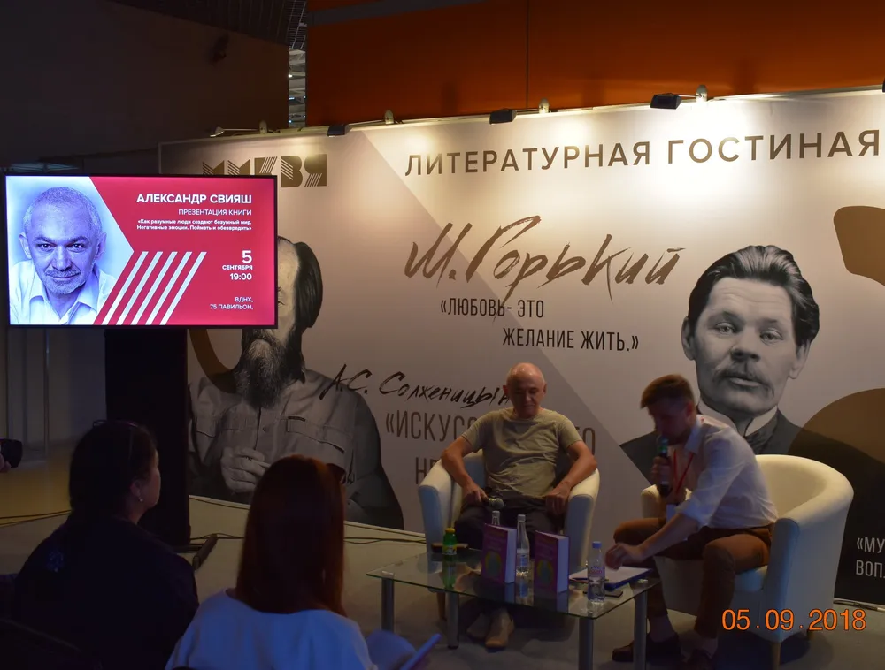Я всё-таки дождался встречи с этим автором. Ждать пришлось три часа, но приобретённые на ярмарке книги позволили провести это время с пользой. Время «Ч» - и аж полтора десятка слушателей; кроме меня — одни женщины. (Предыдущий «автор», некто Свами Даши, собрал на этой же площадке около ста человек.) Сорок минут непрерывного монолога вперемешку с самовосхвалением — как оказалось позднее, автор цитировал свою новую книгу — но дошла очередь и до вопросов.