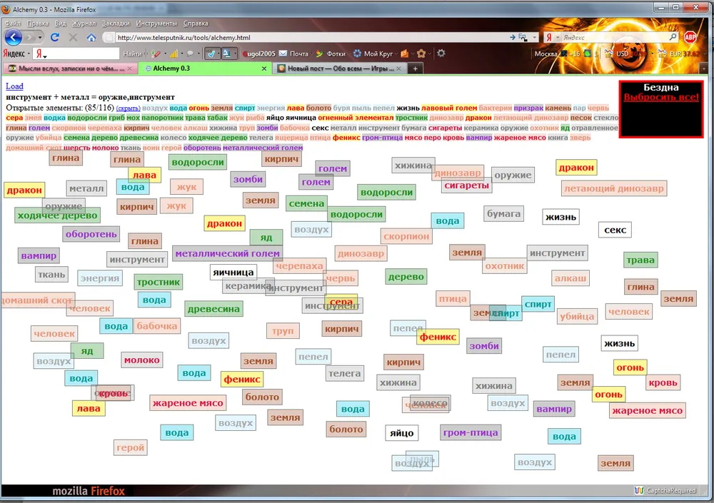 Открытые элементы: (116/116) (скрыть) воздух вода огонь земля пар энергия лава спирт пыль болото жизнь бактерии лавовый голем камень металл паровой котел буря яйцо яичница планктон червь бабочка металлический голем жук водоросли огненный элементал гриб электричество пепел призрак сера змея мох птица феникс трава табак песок стекло семена дерево уголь паровой двигатель динозавр дракон летающий динозавр черепаха ящерица гром-птица ракушки известняк водка ходячее дерево зверь человек труп алкаш зомби рыба вурдалак домашний скот мясо шерсть молоко скорпион жареное мясо кровь вампир оборотень секс глина кирпич навоз кит папоротник цемент хижина керамика инструмент яд пашня тростник бумага пшеница древесина ткань бетон кирпичный дом небоскреб колесо лодка деревянный корабль парусник парусная лодка пароход телега упряжка паровоз оружие охотник отравленное оружие убийца воин селитра порох огнестрельное оружие мука тесто хлеб пиво герой перо книга одежда сигареты голем