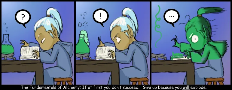 ...Есть два типа хорошего алхимика: атлет и интеллектуал. Хороший алхимик первого типа способен за три секунды перепрыгнуть через стол, выскочить в дверь и спрятаться за крепкой стеной, а хороший алхимик второго типа знает точно, когда пора делать ноги.